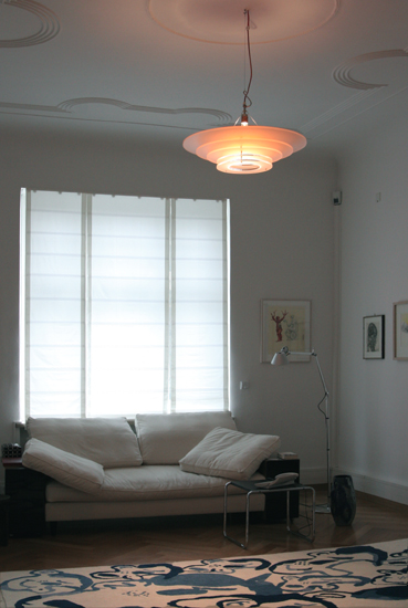 Strahler mit mattierten Plexiglasscheiben und Farbeinsätzen in aprikot als Lochblenden, 150 W, 2005. Hauptanteil der Strahlung nach unten gerichtet Foto:Scarlet Berner