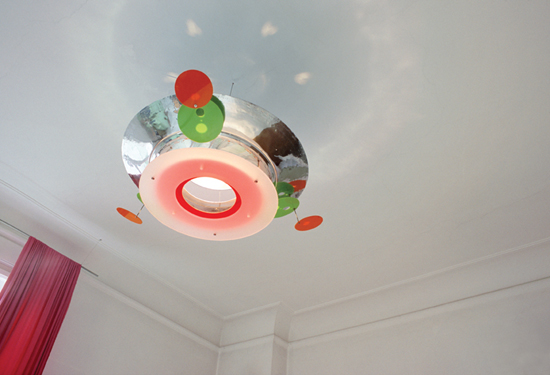 (Holiday on Earth)Großer Strahler mit Hohlspiegel aus Aluminium und diversen Kunststoffscheiben als Lochblenden. Innenseite des Aluspiegels blau metallisiert, dadurch blau beleuchtete Raumdecke. 220 V / 250 W, Halogen, 100 cm, 2002
