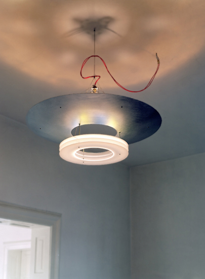 Großer Strahler mit Hohlspiegel aus Aluminium und weissen Plexischeiben als Lochblenden. Zarte blaue und gelbe Farbreflexionen auf der Hohlspiegel-Unterseite. 220 V / 250 W Halogen, 80 cm, 2002