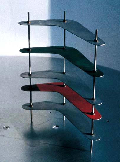 Regal aus Aluminiumplatten und Gewindestäben. Modellfoto, 1985