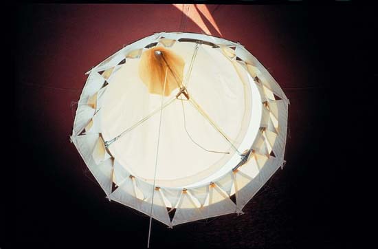 von außen gehängte Zeltkonstruktion in Zusammenarbeit mit Florian Geiger. Ø 5 m, Höhe 6 m. 1981. Blick nach oben in die flexible Dachhaube.