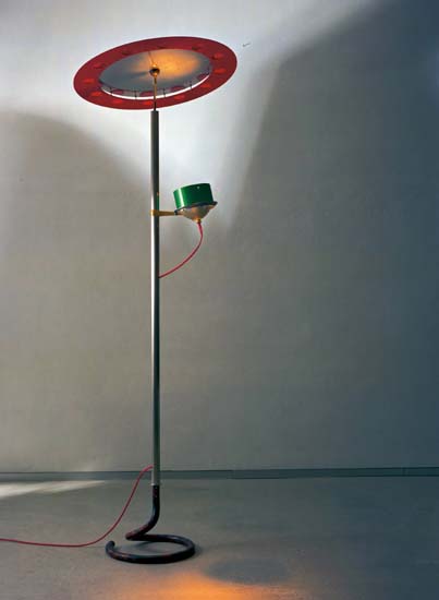 2,20 m große Stehleuchte, verschiedene Metalle, teilweise lackiert und mit Acrylscheiben, verstellbarer Reflektor, Strahler 300 W, 1993 Foto: Scarlet Berner