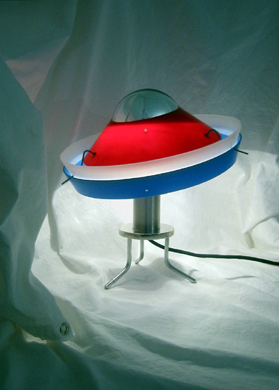 Tischleuchte.Farbige Kunststoffe auf großer kuppenverspiegelter Glühbirne, 2004, "...cool" Foto:Scarlet Berner